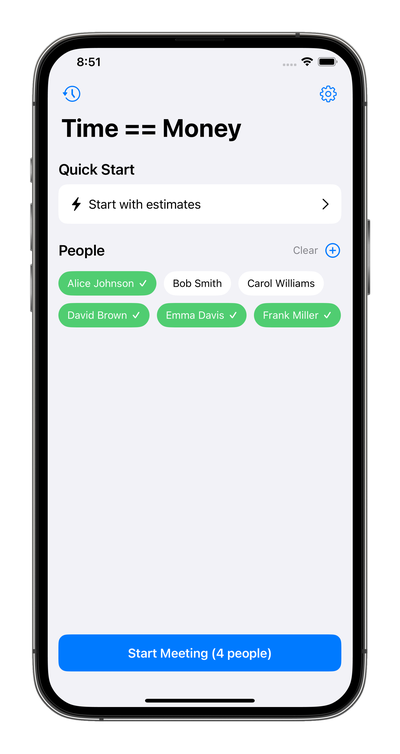 Time == Money shows you the true cost of meetings in real-time. Watch the dollars tick up as the clock runs, and think twice before scheduling that next status update.