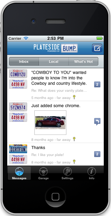 If you see something interesting regarding a vehicle, you can send a message using the license plate as the 'address'. Or, you can just post status updates – and Plateside will forward them to facebook and twitter to keep your friends and followers up–to–date.