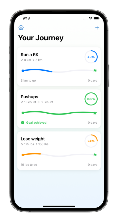 Set your starting point and target, then log your progress as you go. The journey path fills in as you get closer to your goal, changing from orange to blue to green as you progress.