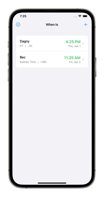 Add your friends, family, and colleagues. When they travel, just tap and update their timezone - your list stays in your order, and you always know what time it is for them right now.