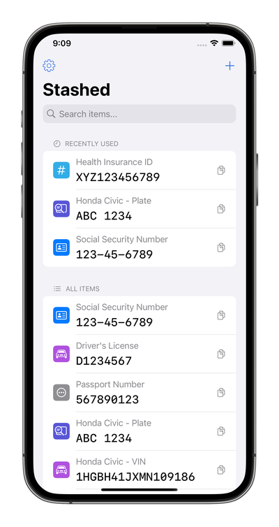 Stashed is a simple, secure place to store information you don't need often but need to find quickly when you do. Your SSN at the doctor's office. Your license plate at the parking garage. Your VIN for the insurance claim. That neighbor's name you always forget.