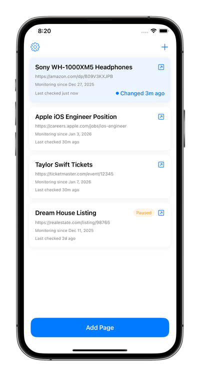 Stop manually checking web pages for updates. Changebot monitors pages for you and sends a push notification the moment something changes.